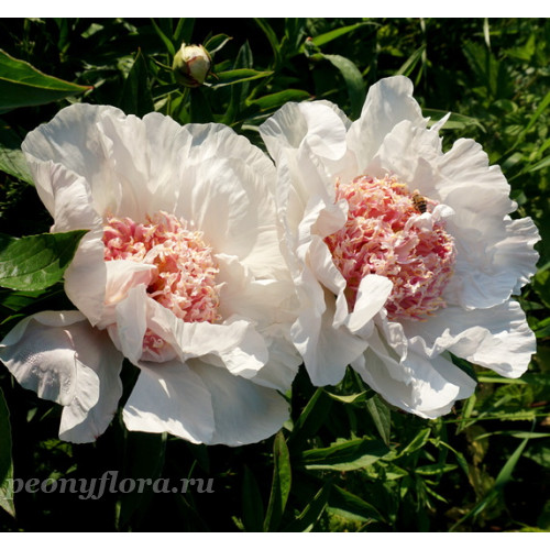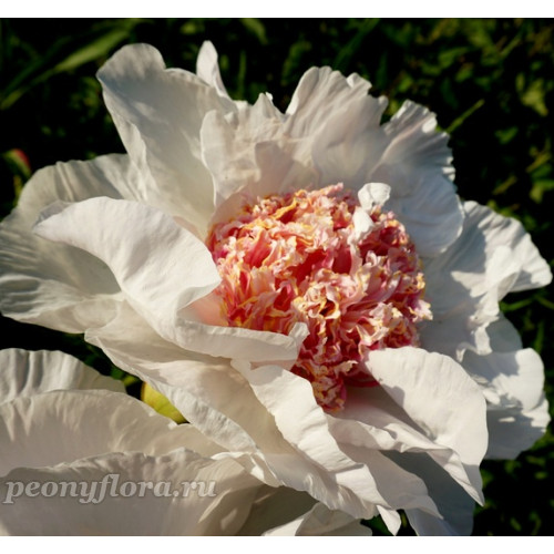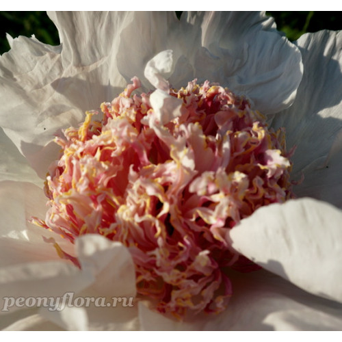 Внутривидовой гибрид p.lactiflora. Японской формы, двухрядный. Внешние петалодии чисто белые, волнистые, слегка сборчатые по краям. Стаминодии тонкие, плотные, бело-розово-коралловые с тонкой желтой окантовкой, закручены в плотный шар размером 1/3 диаметра цветка. Ф=15-16 см. Куст невысокий, слегка раскидистый, Н=65-70 см. Стебли прочные, листья насыщенно-зеленые, блестящие. Средний - поздний срок цветения. Эффектный. В холодное лето может быть светло-розовый оттенок петалодий.