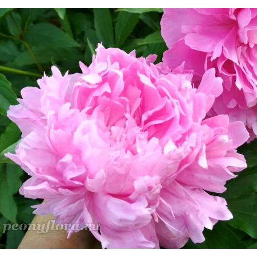 Махровый розовидный. Розовый с легкими отметками красного. Ароматный. Раннего срока цветения.