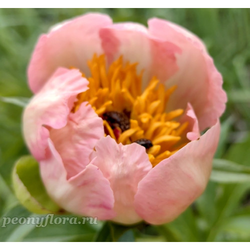 Межвидовой сложный гибрид (Officinalis rubra plena x Saunders 4710, which is a seedling of Mlokosewitschi x macrophylla). Двух-трех рядный, лепестки слегка Волнистые и сборчатые. Его уникальный переливчатый светло-персиковый розовый цвет не встречается ни у одного другого пиона. В центре многочисленные крупные желтые тычинки на коротких красных нитях, пестики опушенные, рыльца красные. Срок цветения очень ранний – конец мая. Ценный ландшафтный пион.