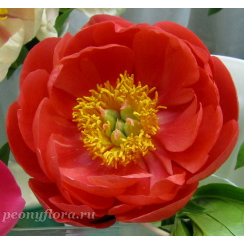 Гибрид. Полумахровый - махровый. От двух до трёх рядов красивых, насыщенно кораллово-розовых лепестков с оттенком оранжевого. Крепкое растение с богатой средне зелёной листвой. Стебли толстые, прямые. Ранний. Самый яркий и красивый из коралловых.
