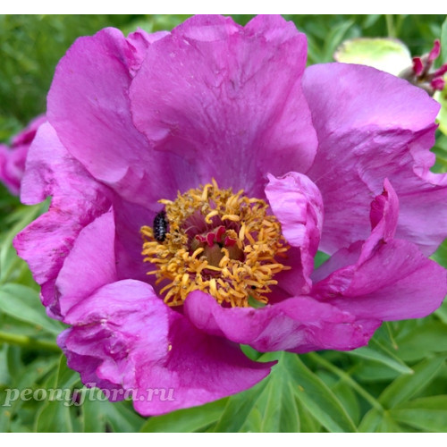 Межвидовой гибрид (P. оfficinalis var. banatica x P. lactiflora ‘President Taff’). Немахровый, чашевидной формы, светло-розовый (RHS 73-A), лепестки слегка волнистые. Куст полураскидистый, листья светло-зеленые. Сверхраннего срока цветения – конец мая. (Описание из книги ПИОНЫ, В.Ф. Горобец, 2015).