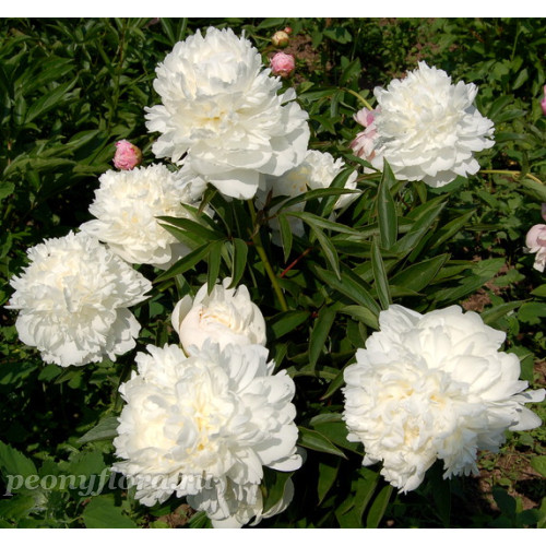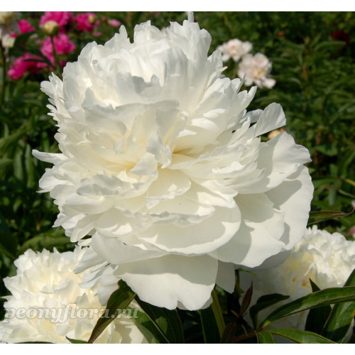 Махровый, розовидный - корончатый, очень высокой формы.Чисто белый с кремовым насыщением в центре у основания лепестков. Аромат очень приятный с цитрусовыми нотами. Средний срок цветения. Исторический. Считается одним из лучших белых срезочных пионов