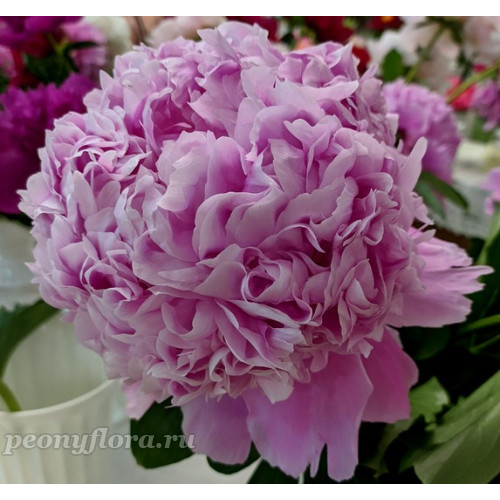 Махровый бомбовидный, крупный цветок размером до 18 см. Розово-сиреневый. Внешние петалодии широкие, плотные. Внутренние - узкие, закрученные, с серебристыми кончиками, образуют большой шаровидный центр. Куст высокий до 100 см. Ранний - средний срок цветения. Ароматный легкий. Исторический.