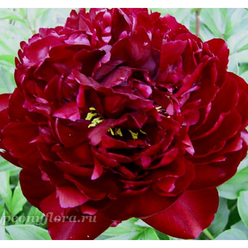 Махровый розовидный, крупный цветок. Рубиновый с оттенком красного дерева, блестящий, видимые желтые тычинки. Стебли сильные. Листья очень декоративные и весной, и осенью. Аромат легкий. Средне - поздний срок цветения. Исторический, популярный во все времена благодаря уникальному цвету и красивой срезке.
