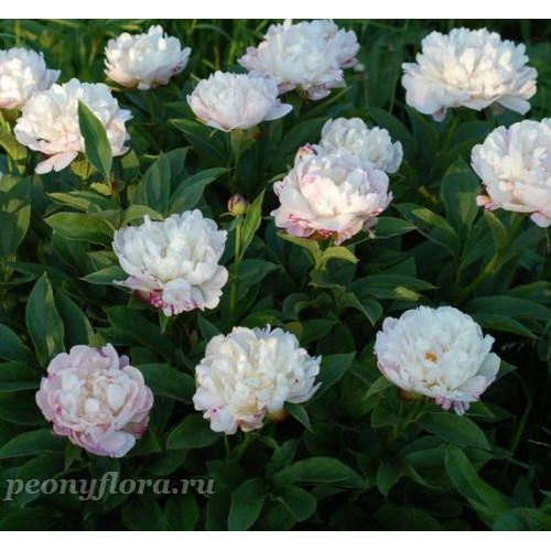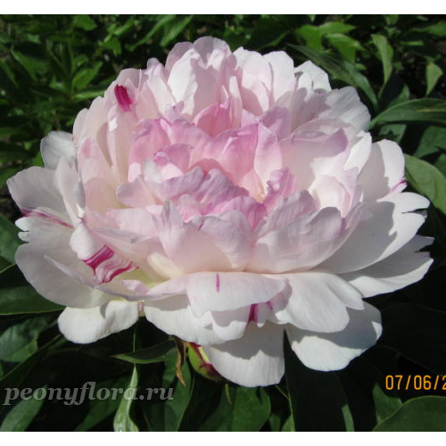 Полумахровый. Размер цветка 12-15 см. Бело-розовый с кремово-желтоватым оттенком в центе. Многочисленные малиновые расплывчатые мазки по краям лепестков к центру дают эффект 'picotee'. Открытый центр из желтых тычинок и темно-карминовых пестиков. Элегантный и уникальный. Стебли прямые, крепкие, куст невысокий 60-70 см. Средний срок цветения. Для срезки и ландшафта.