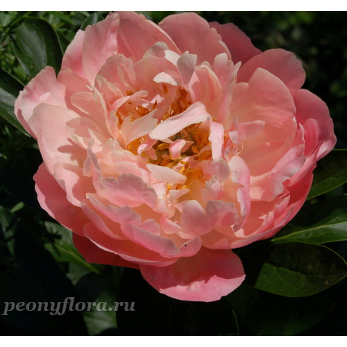 Межвидовый гибрид (Paeonia lactiflora 'Charlie's White' x P. peregrina 'Otto Froebel'). Полумахровый-махровый. Ярко-кораллово-розовый. Пестики кремовые. Обильный. Ароматный. Ранний срок цветения.
