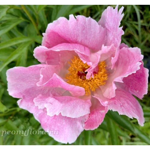 Originator unknown, possibly H. P. Sass, about 1950. Re-registration by the Klehm Nursery, 1985, США. Простой формы. Светло-розовый с темно-розовым крапом. Ф18. Н85. Средний срок цветения. Очень очаровательный.