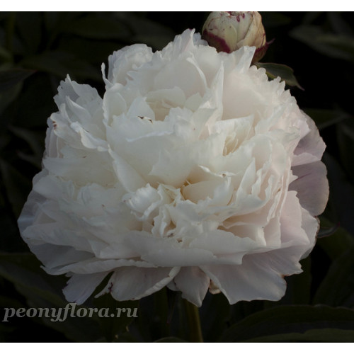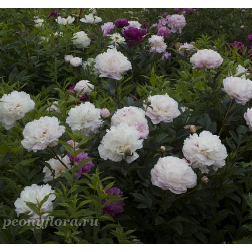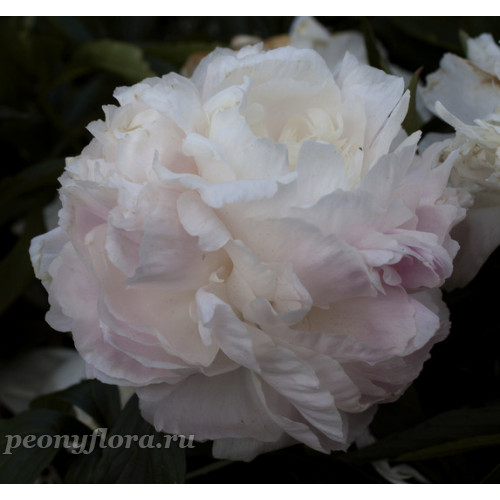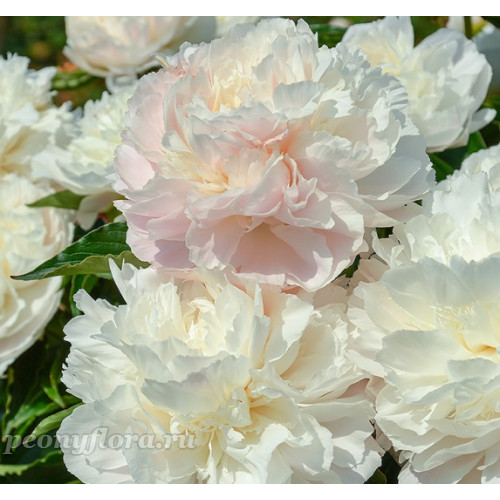 Paeonia lactiflora (‘Festiva Maxima’ x ‘Mme Edouard Doriat’). Махровый шаровидный. В начале роспуска - светло-розовый, позднее чисто-белый. Стебли прочные. Листья крупные темно-зеленые. Аромат легкий. Раннего срока цветения. Очень хороший срезочный сорт.