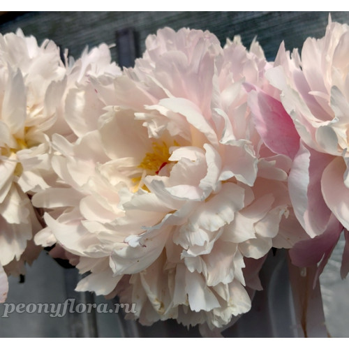 Махровый, розовидный. Цвет от нежно-розового до почти белого, с серебристо-белым отблеском. Приятный аромат. Среднего срока цветения.