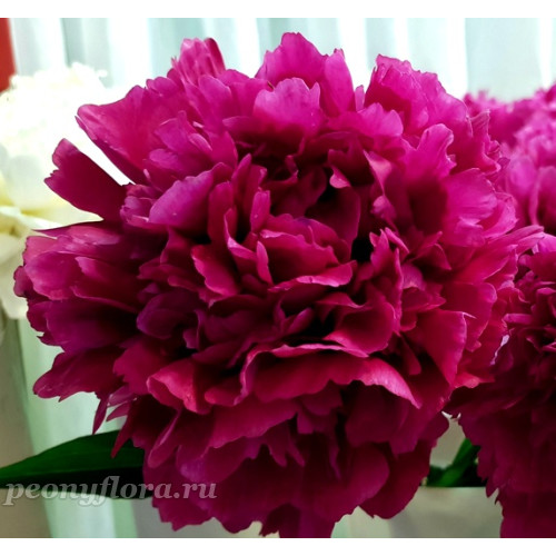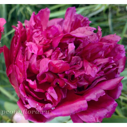 Пион травянистый, внутривидовой гибрид p. lactiflora. Махровый полушаровидный - бомбовидный. Малиновый с пурпурным оттенком. Стебли прочные. Куст полураскидистый. Д=14 см. Н=80 см. Средний - поздний срок цветения. Цветение продолжительное. Ароматный.