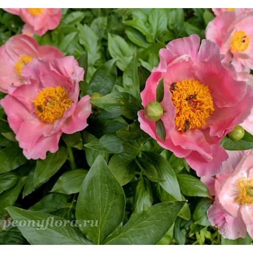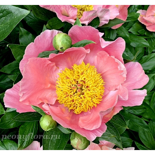 Межвидовый гибрид. Немахровый, двухрядный, с приподнятыми вверх петалодиями в виде блюдца. Лепестки слегка волнистые и сборчатые по краям. Цвет теплый, розово-коралловый. Многочисленные тычинки образуют в центре крупный пушистый шарик. Пестики салатовые, рыльца розово-красные. Цветы крупные, Д = 14-16 см, эффектные. Куст плотный, прямой, средней высоты Н = 75 см, листья среднего размера светло-зеленые с сатиновым блеском. Стебли прямые. Цветы расположены сразу над листьями. Цветение в ранние сроки с конца мая в течение первой декады июня.